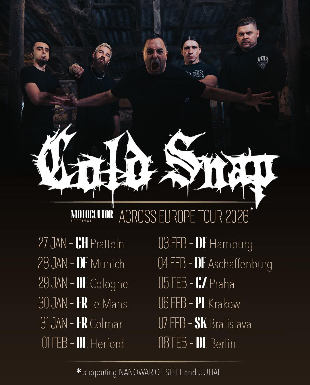 The Cold Snap story began in the spring of 2003, igniting more than two decades of relentless energy, evolution, and pure metal chaos. Since their formation, the band has performed nearly 400 shows across Europe, bringing their unmistakable sound to audiences throughout the continent.